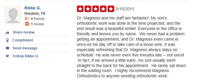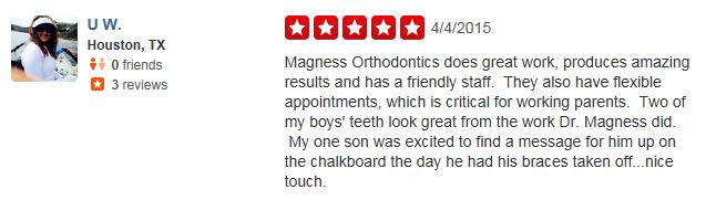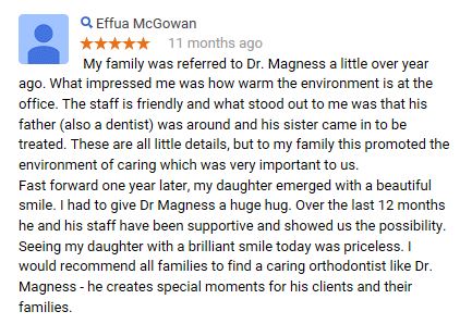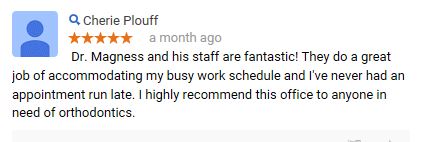 Dr. Magness and his staff are outstanding. The braces experience was so easy for my son, and we got them off earlier than expected. Making appointments were easy and their times really work with students and working parents. I would recommend to all my friends.