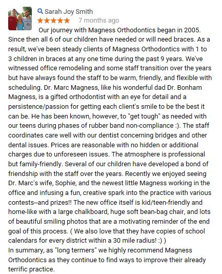 My son is the second generation that has been a patient of Dr. Magness! They strive for perfection and the smiles that come out of their patients mouths show the quality of their work. The staff is wonderful to work with as well. I highly recommend Dr. Mark Magness for all you orthodontic needs!
