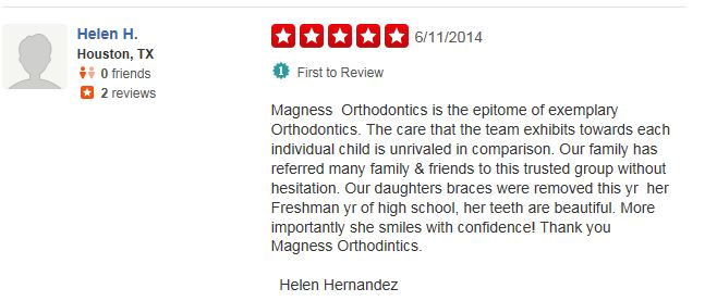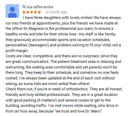 Magness Orthodontics took really good care of my daughters teeth. The entire process was carefully explained, and all our questions are answered. Scheduling is very prompt. We are always seen at the time set in the appointment. The staff is very courteous and accommodating. I would highly recommend Magness Orthodontics to anyone who needs braces.